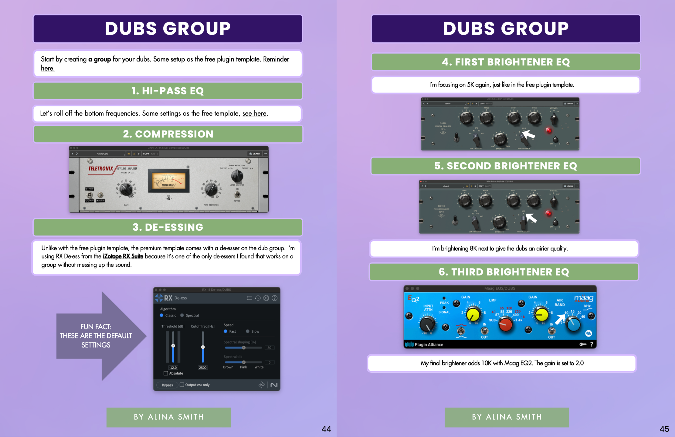- Both templates include processing chains for: leads, ad-libs, verb & delay sends, dub group, bgv group, gang group, pad group, and master bus.